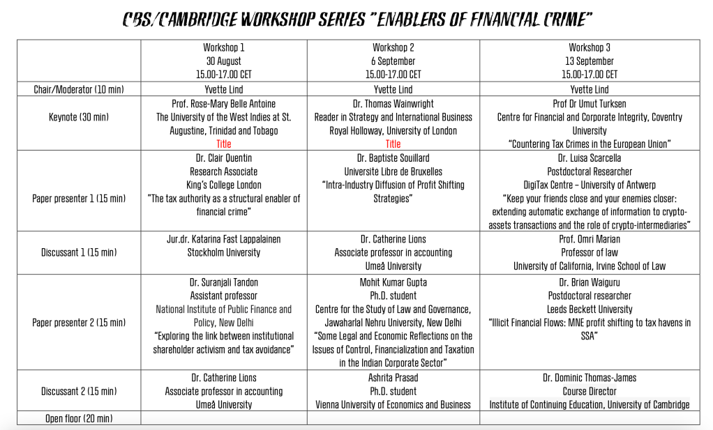 In the lead-up to our regular tax discussion group meetings in Michaelmas Term (October 2021), Cambridge Tax co-president May Hen-Smith will be co-organizing a three-part workshop series with Yvette Lind of Copenhagen Business School to stimulate discussions on tax and society issues surrounding financial crime. The workshop is held weekly on Mondays at 14:00-16:00 British Standard Time and open to all. Pre-registration is required and we hope you will be able to join us for this as well as our forthcoming meetings in the new academic year. Further information can be found here: http://talks.cam.ac.uk/talk/index/161734